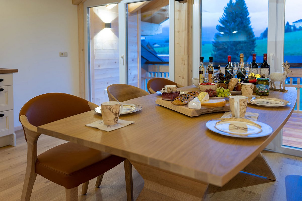 Über den Essbereich gelangen Sie auf den überdachten Balkon mit traumhaftem Blick auf das Rubihorn. Der Balkon ist geschützt vor Sonne und Regen und eignet sich perfekt für entspannte Stunden – vom Kaffeeklatsch bis zum unvergesslichen Sternenhimmel. Das Chalet liegt ca. 900 m vom Skilift und 500 m vom Ortszentrum Fischen entfernt, Einkaufsmöglichkeiten sind ca. 1 km entfernt.