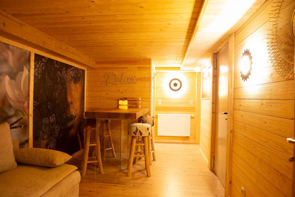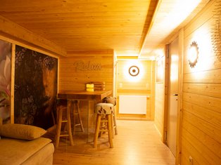 Für zusätzlichen Komfort gibt es einen Ruheraum mit Fernseher und Canapé, ideal für eine entspannte Auszeit. Der Barraum mit Bartisch und Barhockern lädt dazu ein, den Tag in geselliger Runde ausklingen zu lassen. Zudem stehen eine Dusche und ein separates WC zur Verfügung, damit Sie sich nach dem Saunagang frisch machen können.